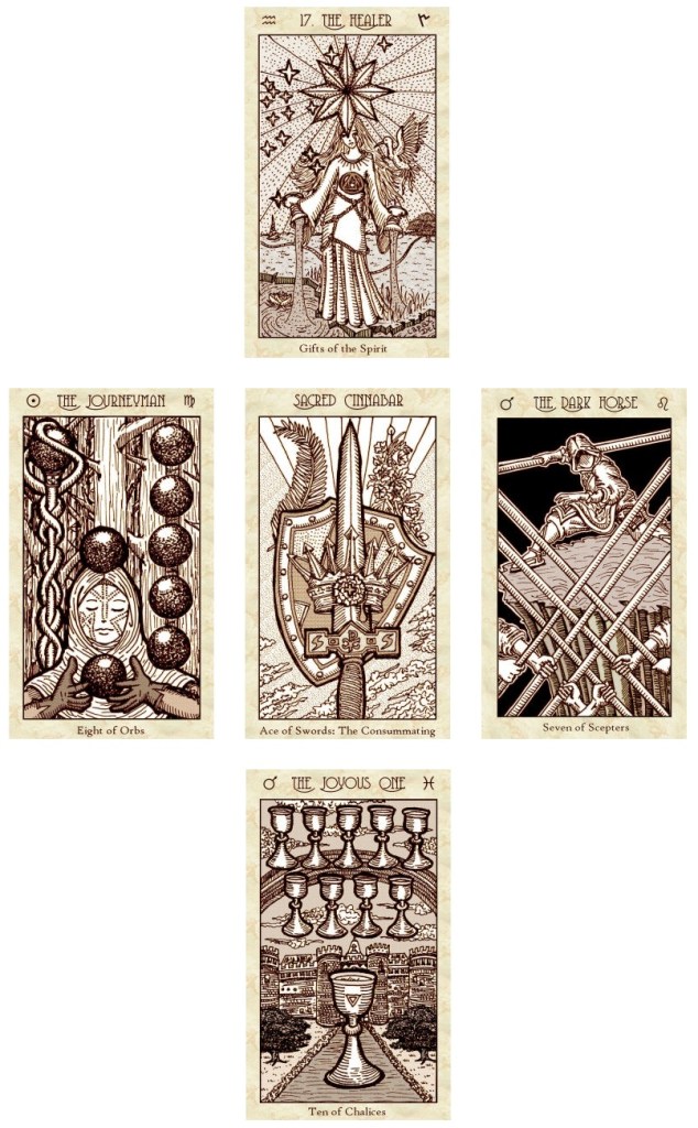 To counteract The Destroyer (Ten of Swords), I went with The Joyous One (Ten of Chalices/Cups). For the Tower, I went with The Healer (Key 17: The Star). For the Three of Swords, I opted for the Eight of Orbs, to endow me with what I will need for the hard work it takes to change my circumstances, to embody the Journeyman and remind myself that the power rests in my own two hands.