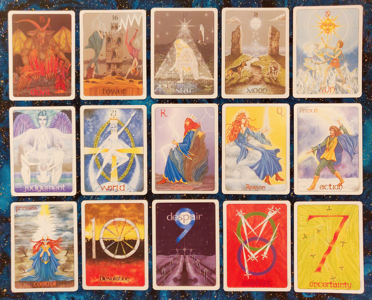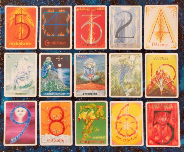 To initiate your understanding of the design, Gill recommends that you lay out the court cards, all the Kings in a row, left to right as Wands, Cups, Swords, and Disks respectively. Then below it, all the Queens in a row, left to right as Wands, Cups, Swords, and Disks, then below that the Princes and then below the Princes, the Princesses. Then when you study the grid layout, you’ll better understand the cosmological movement of power.