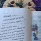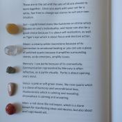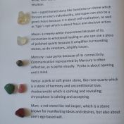 The above are the gemstones Klein provided in her kit set out next to each entry from the companion guidebook. After handling her set of stones, I realize it’s going to be smarter for you to go with smaller gemstones than the larger cabochon ones I had chosen out.