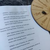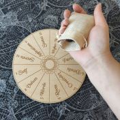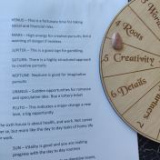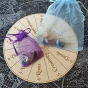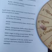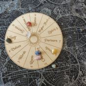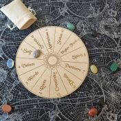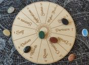 I thought about collecting a set of twelve gemstones to correspond with the twelve zodiac signs. Since the lines and text on the board are wood-burned, you can feel the twelve sectioned houses when your eyes are closed. What if you closed your eyes, spun the board so the orientation became randomized, then one by one, with your eyes still closed, placed the twelve zodiac stones onto the board, one in each astrological house. You would be able to do that through touch only and since you can’t see what you’re doing, it would be randomized and the results could be read in a divinatory manner once you opened your eyes.