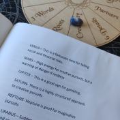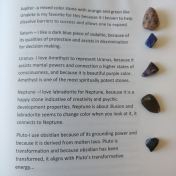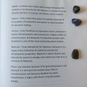 There were two sets of stones. The above two photographs show my attempt to match the given stones with the planet, but I got a little confused. I didn’t see an amethyst in the lot (Uranus correspondence) and for the stone I set out in the above photo next to Jupiter, I couldn’t quite make out what it was.