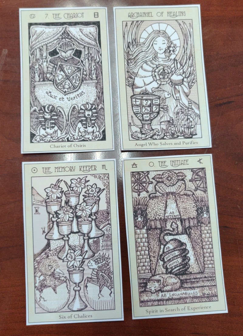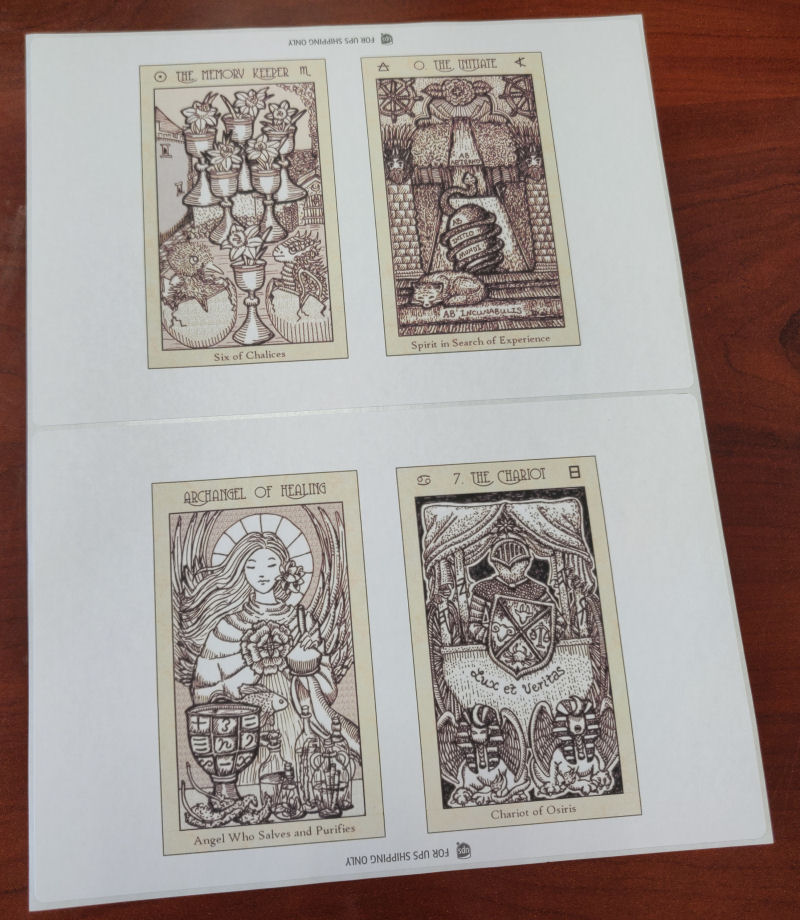I then cut the cards out to size, as shown above. The default I’m providing is keyed specifically for a traveler’s notebook and travel protection. I chose The Chariot, the Archangel of Healing, The Memory Keeper, and The Initiate (for Spirit in Search of Experience).