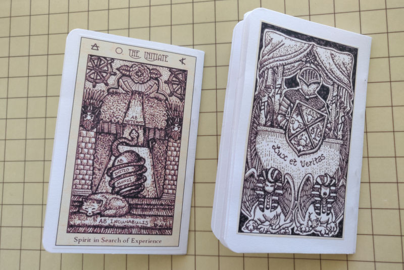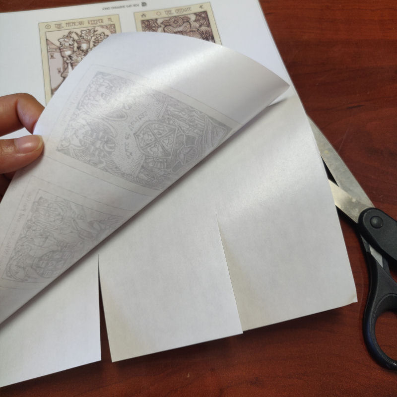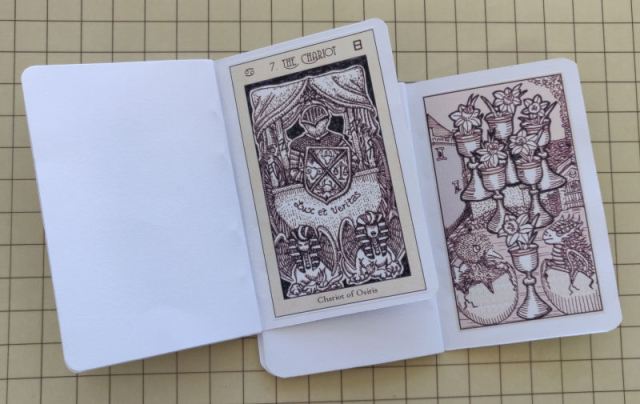 The booklet pictured above to the right is of the tarot art only, while the one to the left is the actual SKT cards. That’s only because the first time I printed out the stickers, I used the wrong dimensions, so I had to cut the borders and work from the card art only.