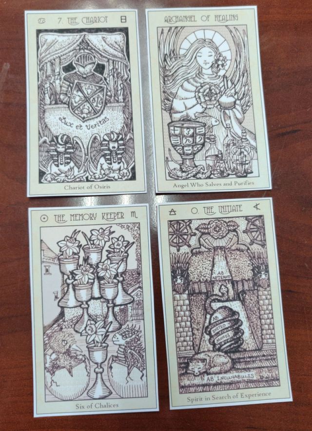 The Chariot is for travel protection. The Archangel of Healing is to keep me safe and, most important of all, healthy. The Six of Chalices is The Memory Keeper, which is the whole theme of my notebook, and The Initiate, Spirit in Search of Experience, also exemplifies the main purpose. Also, for me, there’s just something so inspiring about the imagery on The Initiate, that when I look at it, it motivates me to take a leap of faith and always go for the adventure.
