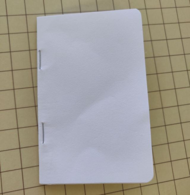 And here’s the finished booklet before affixing the stickers for the front and back covers. From the photograph it looks like I folded the booklet into size and then stapled it, but no, as you saw in the instructions, I kept the booklet open and stapled the pages together, saddle-stitch style. I’m just terrible at aligning the staples to the crease. Hopefully you’ll do better.