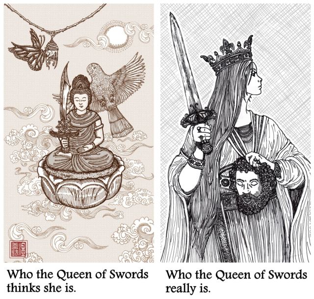 I ended up drawing two versions and hope you’ll help me out by voting on which one you prefer. I’m torn between the two because they go in pretty different directions, not just in the art, but especially in terms of interpreting the Queen of Swords. You’ll see what I mean.