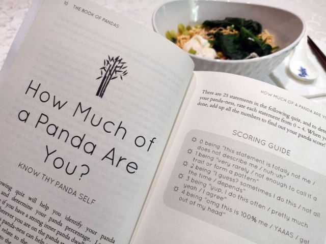 As an interactive text, the guidebook, The Book of Pandas starts with a quiz: “How Much of a Panda Are You.” And yes, that’s a bowl of cooked instant ramen you see there in the background.