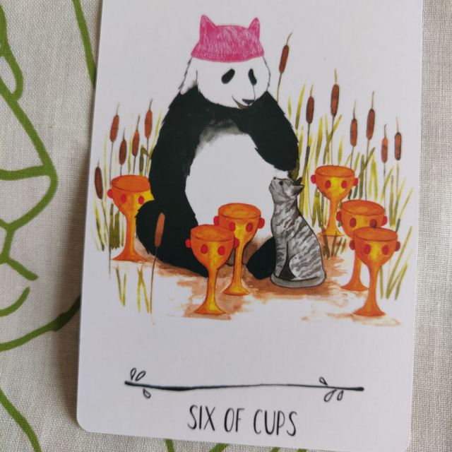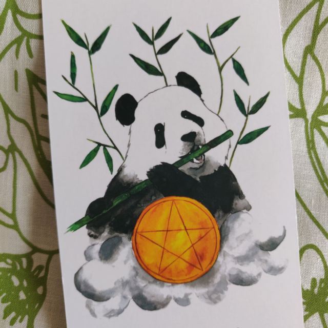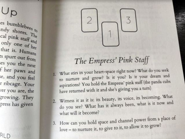 I also appreciate the decentering of European imagery. I think one of the things that has kept me on the sidelines of tarot, despite my curiosity, has been how much it feels like a set of myths and archetypes that have historically have not included immigrants, especially Asian diasporic immigrants. I think the other tarot deck that made me go OOOOOH was the Slow Holler Tarot, but that is a deck that I’m a visitor/guest to the imagery and stories, whereas I think the Panda deck can be a place I make a home in, as a newly arrived immigrant to tarot. ^_^