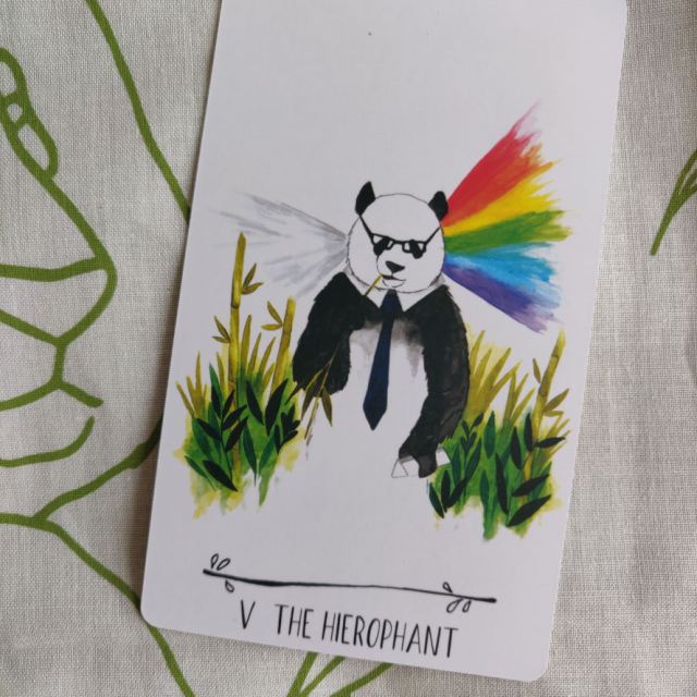 I love The Hierophant card, where the panda’s head is a prism. When The Hierophant Panda shows up in your reading, it’s because this panda archetype has taken a keen interest in you. There’s resonance between you and Hierophant Panda, and as a result, because he’s smarter, more learned, and a whole lot older than you, has some words of advice to share.