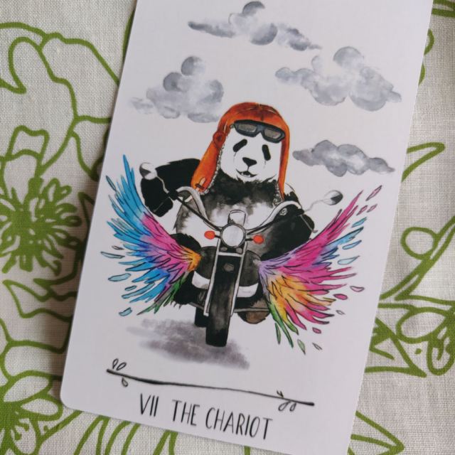 The Chariot card, for instance, depicts Victor the Panda with his bae, a winged motorbike.