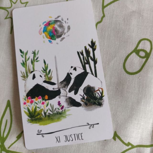 There’s something innovative and unique to Tsan’s depiction of the Justice card here: there are two pandas, whereas more commonly the Justice card is depicted with a solitary figure. But why are there are two pandas? Look closely at what they’re doing and you’re going to laugh out loud.