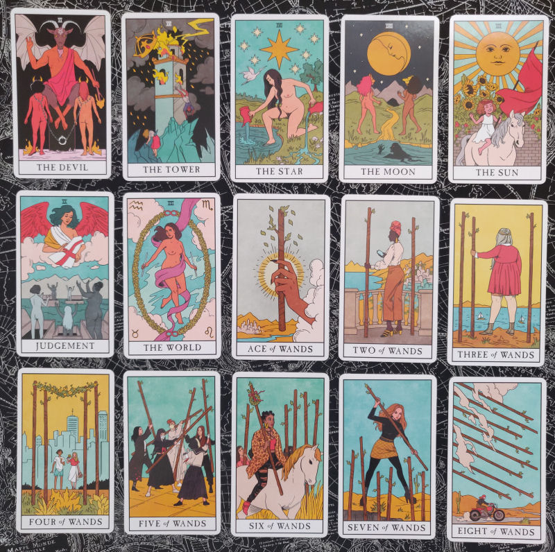 The imagery in the deck unapologetically dates it to our decade, where you’re seeing a smartphone in the version iconic of this decade, the style of dress on the figures, such as the shredded spandex leggings in the Six of Wands, and the motorcycle zooming across the Eight of Wands.