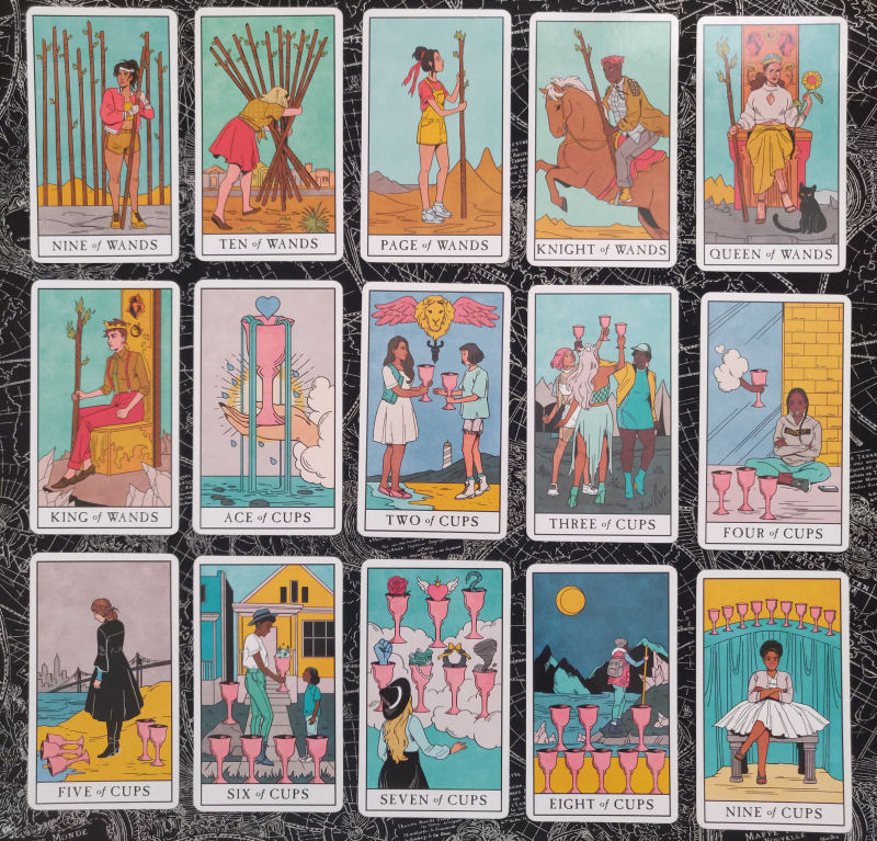 The deck comes with a card-size hardcover guidebook. I love the little Foreword by DC Comics writer Vita Ayala: “Witches can be found across all cultures. They are holders of wisdom and paranormal power, and Tarot is often associated with them. . . . Modern witchcraft has in many ways become a refuge for the disenfranchised. For many people of color, LBTQ+ people, and femme folks, it can be a way of retaking power.”