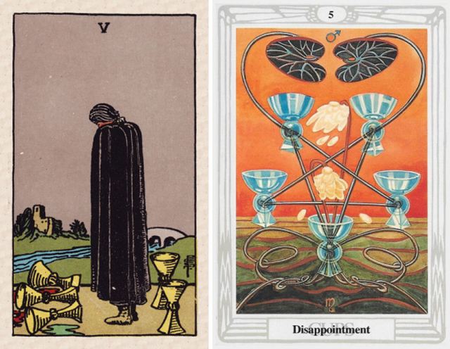 Just for reference, for those who need it, in the Rider-Waite-Smith, the Five of Cups is that card with that mysterious figure in a dark cloak, looking sullen, hunched shoulders, mourning over three spilled cups, with two filled cups in the back. Remember? The keyword on the Thoth Five of Cups is “Disappointment.”