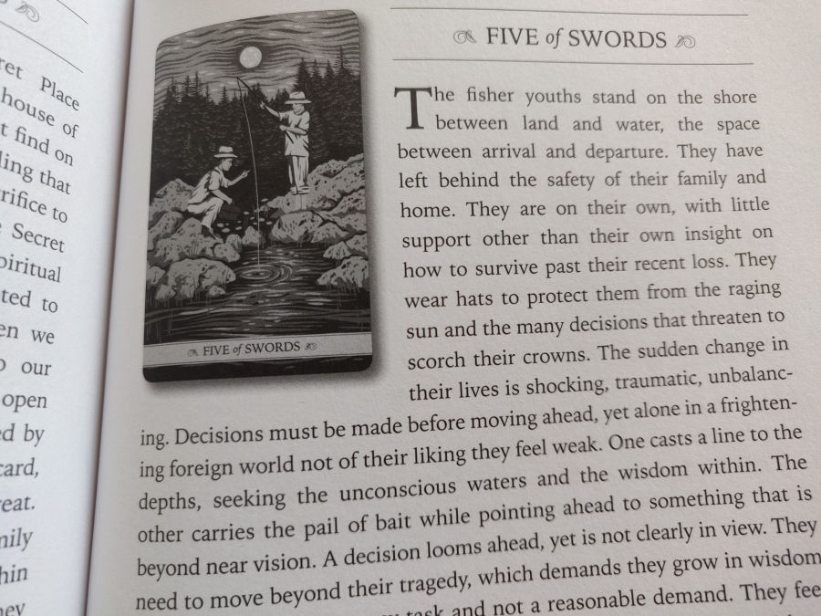 The Five of Swords, for instance. Let’s take a peek inside the guidebook. Here, the essence of the Five of Swords is expressed through youths fishing by a shore, standing between land and water, symbolic of that liminal space between arrival and departure. This card, inferred from the guidebook, is about a sudden change coming soon that will require assertive, balanced decision-making, and the event will result in personal growth and wisdom.