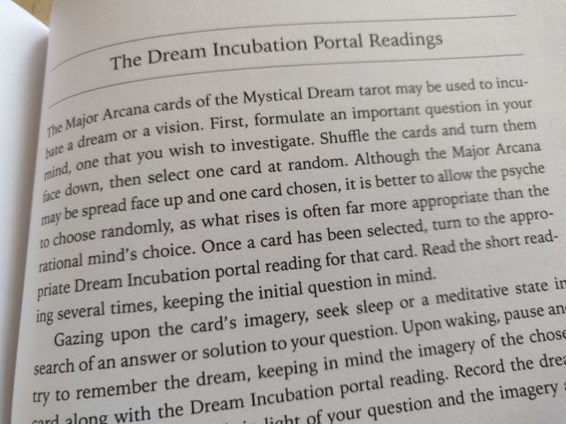 This end section of the guidebook was one of the most insightful. You can use the Major Arcana of the tarot, specifically the cards from Mystical Dream, as dream incubators, to incubate a dream or vision. Try this out for yourself.