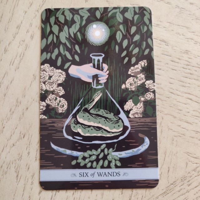 Here’s the Six of Wands, which for me has some strong Magician-as-alchemist vibes, and right I was, as those vibes are confirmed by the guidebook. Removing the card title, the card entry for the Six of Wands reads a little like an esoteric rendition of Key I: The Magician. “The joy of creation reaches the ultimate alchemical level,” the entry begins. We’re talking about the “serpent of wisdom” here, “self-realization is evident…” and “wisdom rising from the creative egg.”