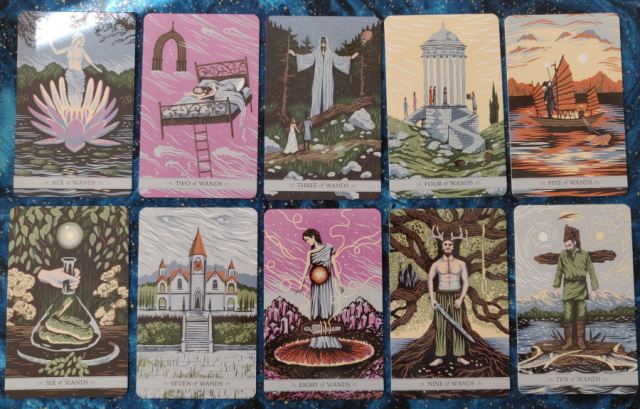 Something about lotus blossoms floating atop water always gets me thinking of the Suit of Cups, but no, here we are in the Suit of Wands, Fire. When you look at all ten pip cards from the Suit of Wands, a clear theme emerges: dominion, housing, domain, and marking physical space. Start with the bed in the Two of Wands, for instance, which by the way is the most interesting Two of Wands I’ve seen in a while. Four of Wands, Seven of Wands– you see building structures. The Eight of Wands is reminiscent to me of casting a magical circle– the magician’s space. And so on.