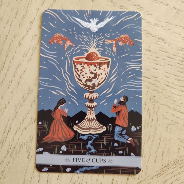 SO… what we’re really looking at here is more of a traditional, historic meaning of the tarot Five of Cups in the Tarot de Marseille. Mathers describes the Five of Cups as meaning “Union, junction, marriage, inheritance.”