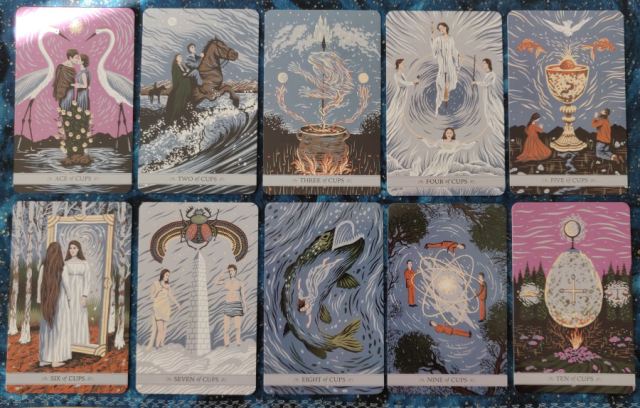 So then the question arises: Is this tarot? I still say yes, by the way. I think it’s unconventional tarot if you are establishing TdM, RWS, and/or the Thoth systems as conventional and saying a creator must work within the established scope of those systems. If you’re lenient with your definition of “tarot” and just need the 78 cards, the Major and Minor subdivision, 22 and 56 respectively, with the Minors into the four suits, Ace to Ten pips and four courts, then yes, you most certainly have a tarot deck here.