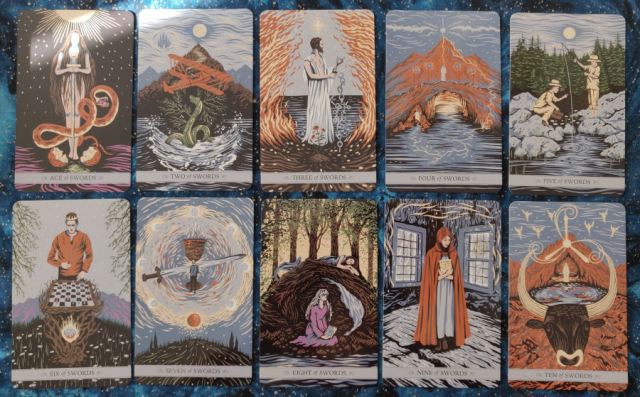 The images in this deck are all sourced from Piedilato’s dreams, which she then transcribed through the structure of the tarot deck. However, I’m not entirely sure whether Piedilato herself then created the art based on her dreams or whether Tom Duxbury was the artist commissioned to bring her dream visions to life. Either way, the artwork is beautiful. I love the style of art. It is in perfect harmony with the deck’s premise and point of view.