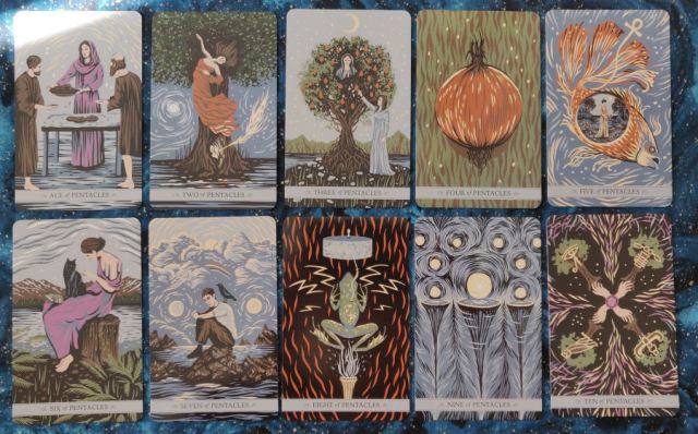 From there, I shed what I think I know about the tarot and instead, let the imagery and the symbols on the card speak to me. What are the figures in the illustration trying to show me, trying to express to me? How do I interpret the symbols as signs and omens? What does the frog in the Eight of Pentacles signify to me? If the Four of Pentacles appears in a reading, take time to meditate and perhaps even journal about the onion.