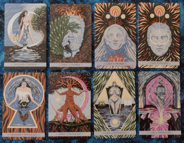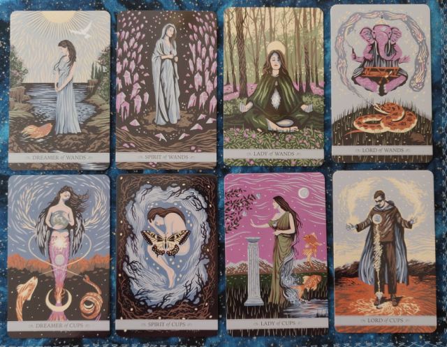 The court card titles have been renamed. The tarot Page is the Dreamer, the Knight is the Spirit of that element, the Queen is the Lady, and the King is the Lord.