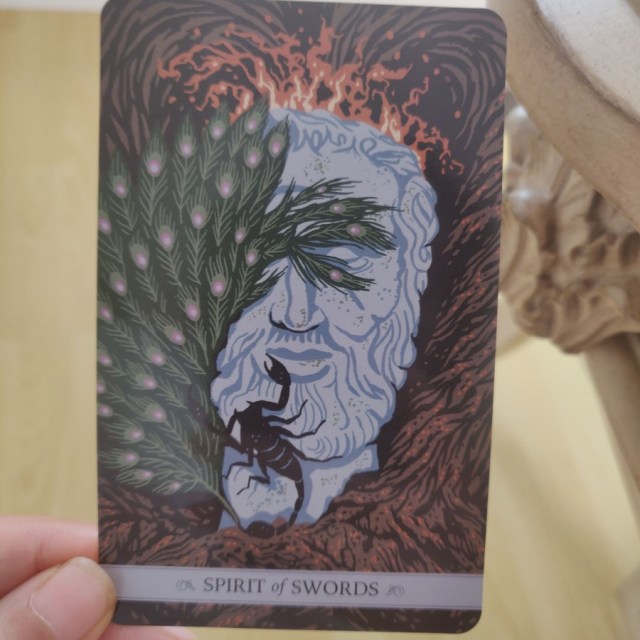 How I like to read with this deck is to see each card as a vision in a dream. I’m walking through the dark woods and suddenly an enormous oak tree in front of me opens itself and out emerges that flaming stone head, peacock feathers, and the scorpion climbing up its side.