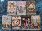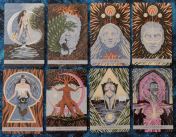 This deck is an intriguing, profound interplay of dream imagery and traditional meanings– more of a dynamic blend than I first realized. It has no pretension to be a new system. It combines golden dawn symbolism and the author’s personal dream visions, emphasis on the latter. I am impressed with the originality. With this one the lady’s extensive knowledge and wisdom leads the skillful male artist. The results are a tribute to these two collaborators.