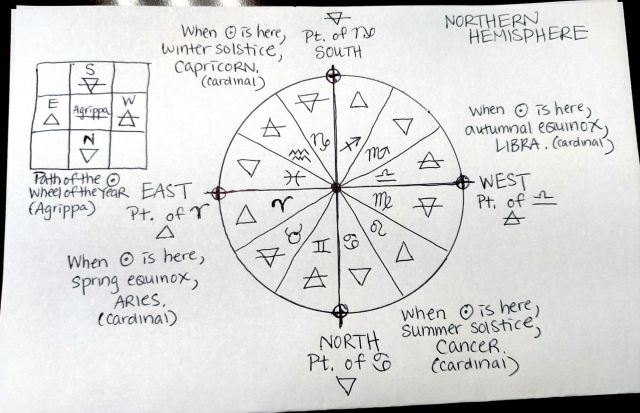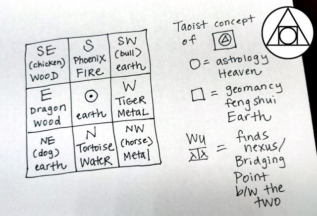 In Taoist metaphysics, we commonly reference the Huang Dao, which translates to Yellow Path, which is describing the Path of the Sun. Therefore, it aligns best with Agrippa’s method of reasoning for the elemental-directional correspondences since it is, in essence, the wheel of the year, marking the equinoxes and solstices However, yes, immediately you can see the discrepancy with the south between the Western Agrippa system and the Eastern Taoist system.