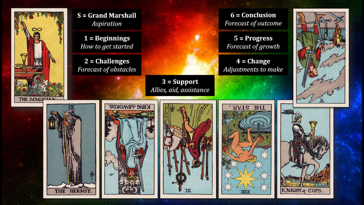 Toward the end of the video, I shared a Parade reading I did with the RWS. Note how Cards 2, 3, and 4 are all reversed, and the final Card 6 doesn’t prognosticate the most desirable outcome. How can you work with intention-setting to re-align the energies and clear a better path to success?