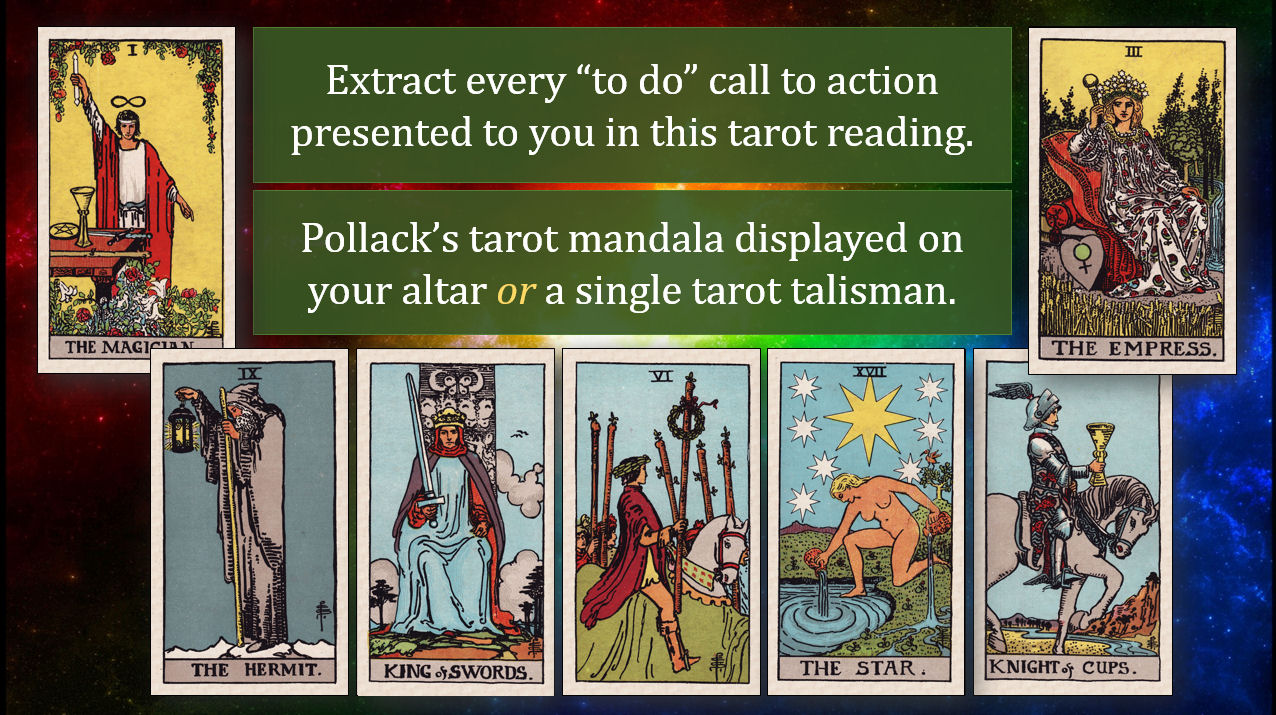 If the final outcome prognosticated by your Parade Reading is one you’d like to proactively change, then after you complete this session, follow it immediately with the one on Changing a Negative Reading and create a tarot mandala.