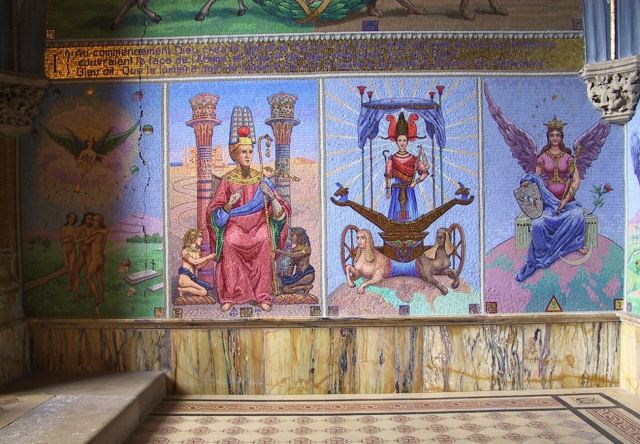 This was also the site where Oswald Wirth completed Le Tarot, des lmagiers du Moyen Age, or better known today as Tarot of the Magicians. In the above snapshot from inside the chapel, left to right you’ll see The Magician card, Death, Justice, and The Fool.