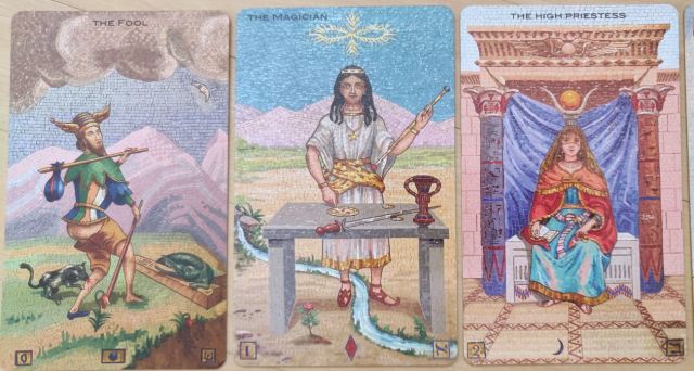That is such a cool Hierophant card and when placed side by side with The Lovers and The Chariot, you can spot the pattern similarities across the three cards.
