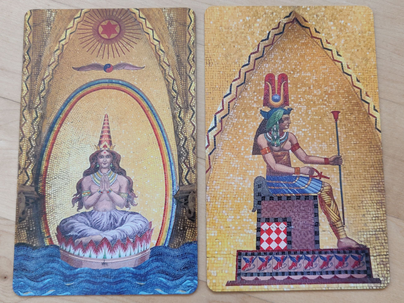 The tiles are made of enamel and gold mosaics with a style that is strongly Greco-Roman and Egyptian inspired. By the way, scroll back up to study the High Priestess, The Empress, and then take a look at the Justice card. Interesting how the Justice card here features the pillars typically associated with the Rider-Waite-Smith High Priestess card.