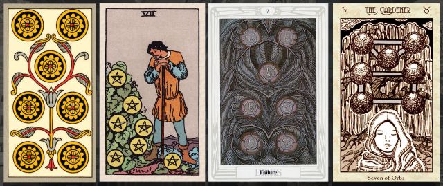 - the Seven of Pentacles/Disks is action vs. non-action.