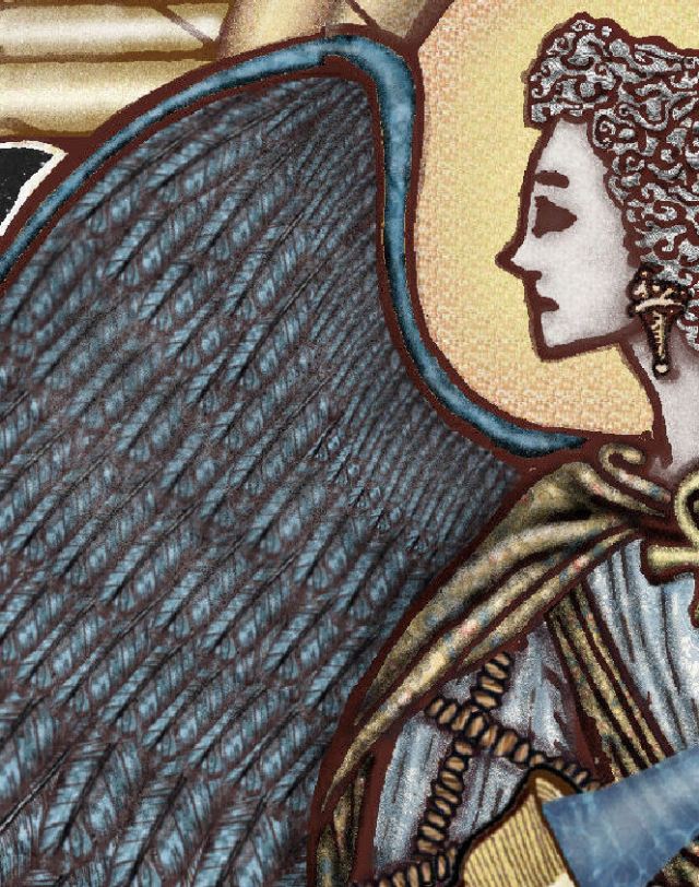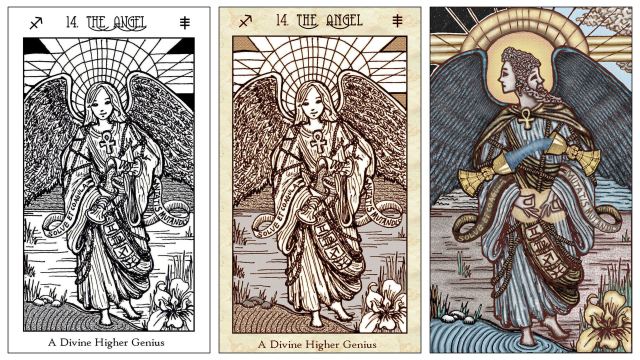 I changed up the angel’s head, hands, and positioning of the goblets, with that double-headed thing inspired by cards from the Tarot Mantegna 1465.