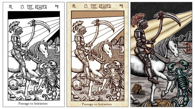 I had spent a ton of time drawing and coloring in Charlemagne’s crown for a previous (rejected) draft of The Emperor, and then since I went with what I did, I ended up not using that crown, which I had spent a ton of time creating. SO… I jumped on the opportunity to refurbish that drawing and add it to my Death card.