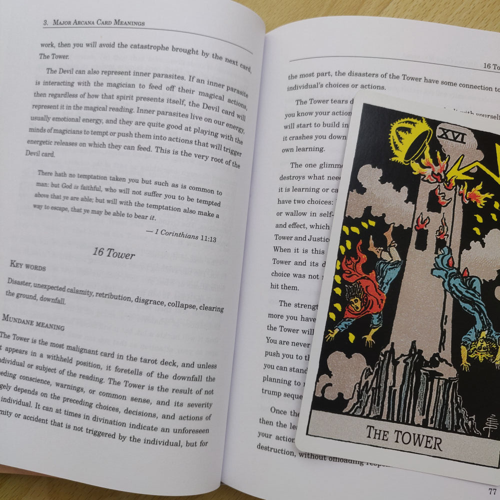 I’ll go through another entry to demonstrate, though just in brief this time. I pulled Key 16: The Tower card. The author’s keywords: disaster, unexpected calamity, retribution, disgrace, collapse, clearing the ground, downfall.