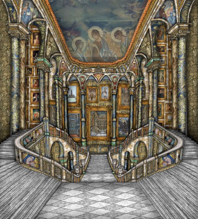 My version features famous 17th and 18th century Russian paintings to keep in theme, but then the back wall got fun– I went Vermeer and put in framed “paintings” of other cards from this deck. =) The centered work of art along that back wall is an earlier draft of this illustration. Fun, huh?