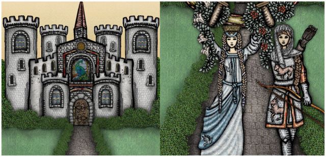 Hopefully each court card is easily discernible, where the Archangels (tarot Kings) feature the four magic squares, Shields (tarot Queens) have the, well, talismanic warding shields, the Shining Ones (tarot Knights) feature the elementals, and the Strongholds (tarot Pages) feature scrolls, to denote their messenger roles.