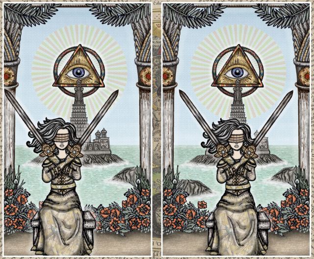 Amazing, beautiful, extraordinary and oh so many words. I love the 2 of swords centered, but I also know what you mean in art elements and principles of design 1/3 principle etc you should never have main image in center. If you really want to position something off center, I would keep her sitting in middle, but place the Lighthouse and all seeing eye to the right and more in the background, a little smaller maybe and maybe at or near the line of water and sky meeting. Just my input 🙂 or keep as is in middle. I do not like the off center card as it is shown. Amazing progress as usual 🙂 Sending hugs and love