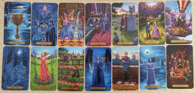 You can click on any of these photographs for a slightly larger view of the cards. They’re absolutely beautiful and the cool tones with the accents of warms interspersed here and there are perfect. The deck is based on the RWS system, but this isn’t a clone. Wright and Smith have reinterpreted the essences of each card through the stories by Poe to create something unique.