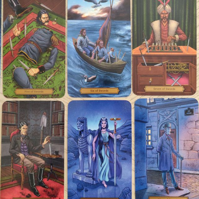 The suit of Swords brings to life the wit, the logic, and intelligence of Poe. The “Tell-Tale Heart” for the Three of Swords… of course. =) “The Murders in the Rue Morgue” for the Ten of Swords paired with that illustration is perfectly spooky.
