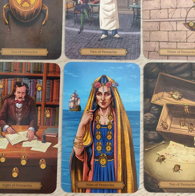 That’s one of my favorite Ace of Wands, by the way. “A large candle burns in an old library. Blank notebooks signify ideas on the verge of actualization. Gold pens represent the freedom we have to create the reality of our dreams.” Each illustration is saturated with adventure and suspense. It’s incredible how Smith captured so much of Poe into his art.