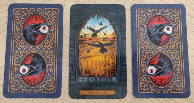 This is “The Raven.” Suddenly there came a tapping… as of someone gently rapping, rapping at my chamber door… Changes are coming, and they come swiftly. Opportunity knocks and you need to be quick on your feet. Do not stall when making your decision. What decision to make, you ask? The one that brings change, that takes you forward. Heck, there may be travel in your short-term future. If you’ve asked a heavier question and received this card for your reading, consider the possibilities of relocation. If your inquiry was work-related, your career is about to take off and soar, in all the good ways.
