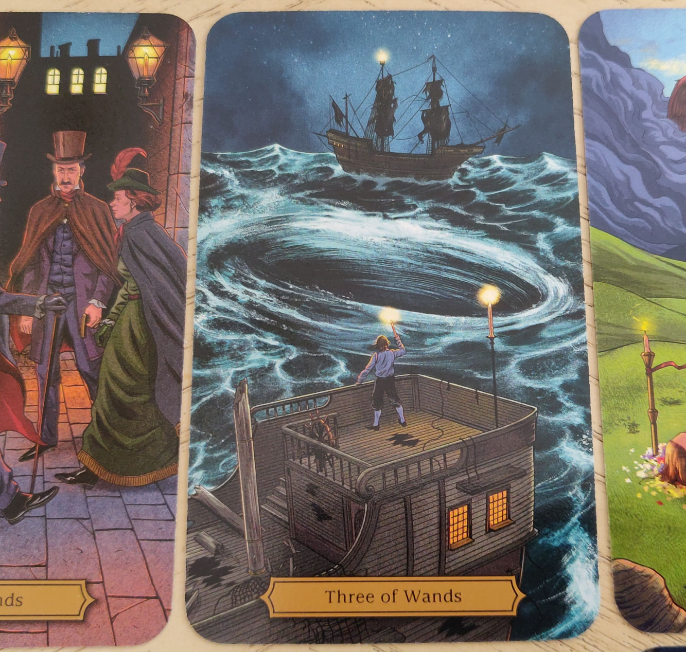 Take this Three of Wands, for example, which is a reference to “MS. Found in a Bottle,” about a narrator who sets sail from Batavia (modern day Jakarta, Indonesia) and gets trapped first in a sandstorm, then a whirlpool before the narrator is thrown overboard and drowns, leaving behind just his manuscript that he’s written of his adventures.