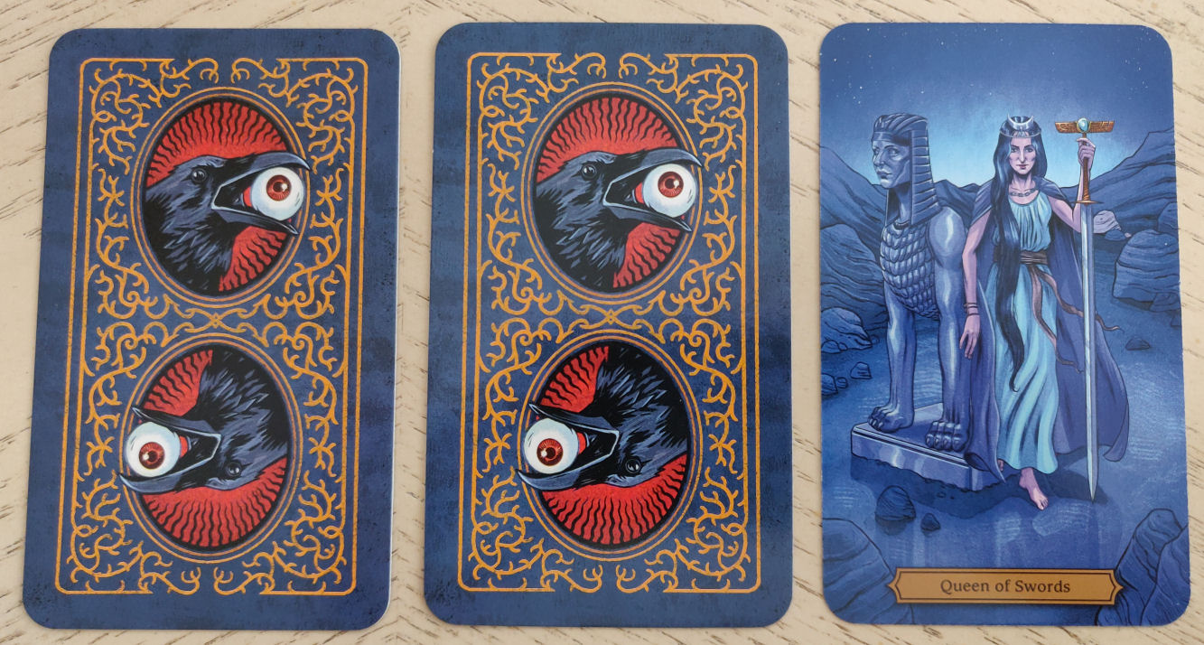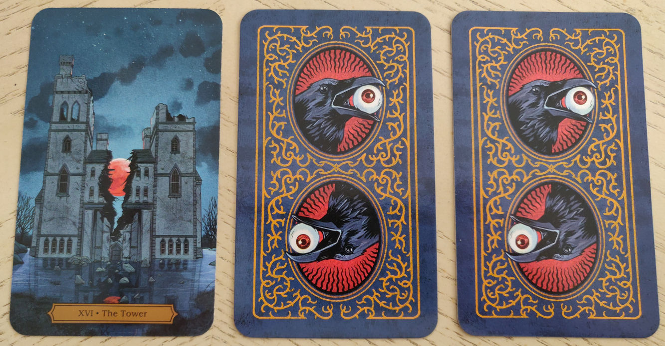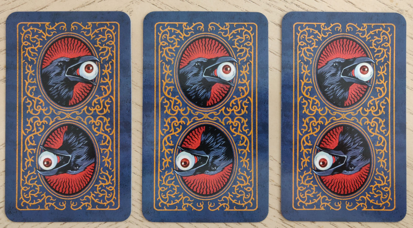 In terms of deck design, the publishers went with borderless and a high-gloss finish. High gloss doesn’t feel right juxtaposed with Poe. That plus the choice to go borderless gives this deck a very contemporary 21st century feel. The digital art style here also feels very modern.