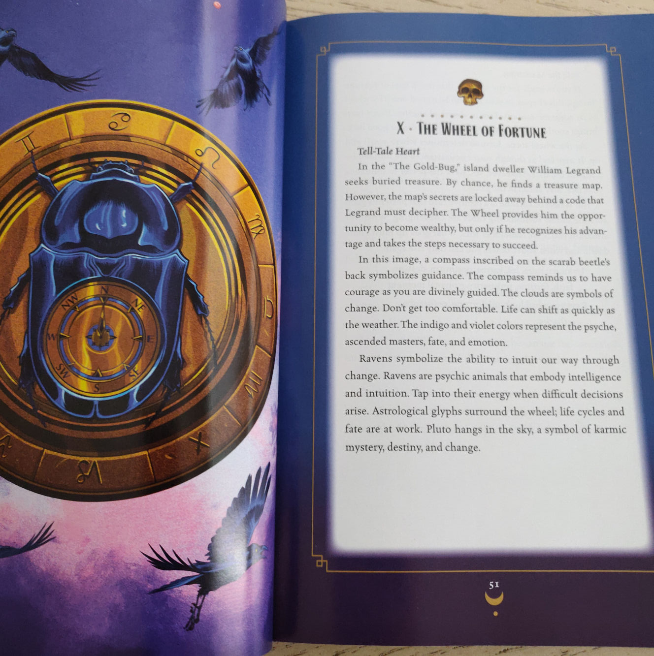 For a special interest deck like this, its companion guidebook is exactly what you’d want it to be. It’s got all the primer info a beginner would need to render this a perfect starter kit for a tarot newbie. The seasoned tarot reader is also going to greatly appreciate Wright’s interpretations of the cards and how she’s connected them to Poe. The full-color glossy pages are a feast for the eyes.