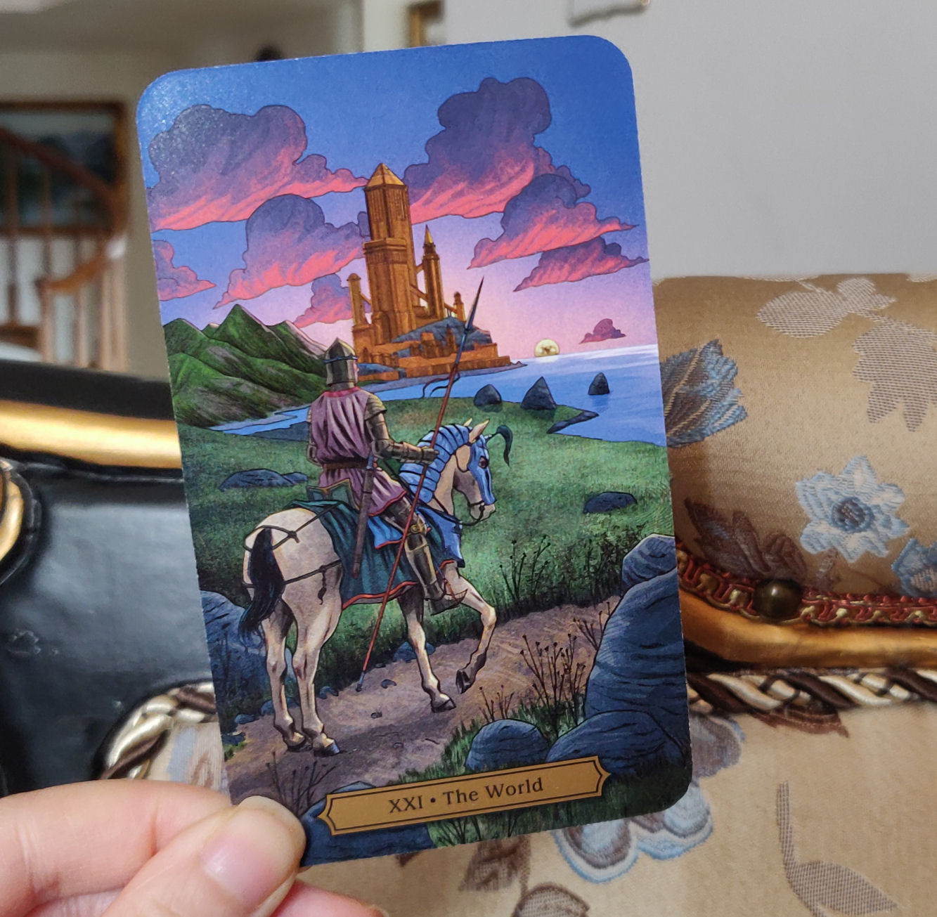 I love the choice to go with Eldorado for Key 21: The World card and getting to see Smith’s imagining of the Golden City. Wright goes in-depth with the symbolism here. For instance, the green mountains symbolize verdant success. The sunrise in the background represents a new era beginning while the setting full moon along the water’s horizon shows that the knight’s mission has come to its end. I love the keyword interpretation Wright has added for Key 21– world travel.